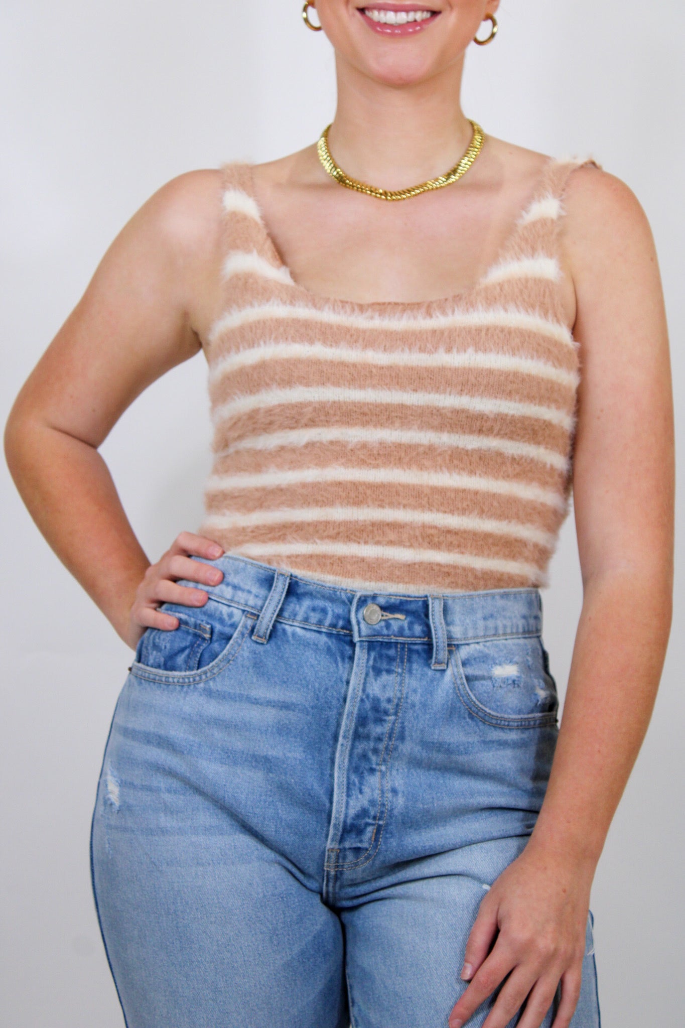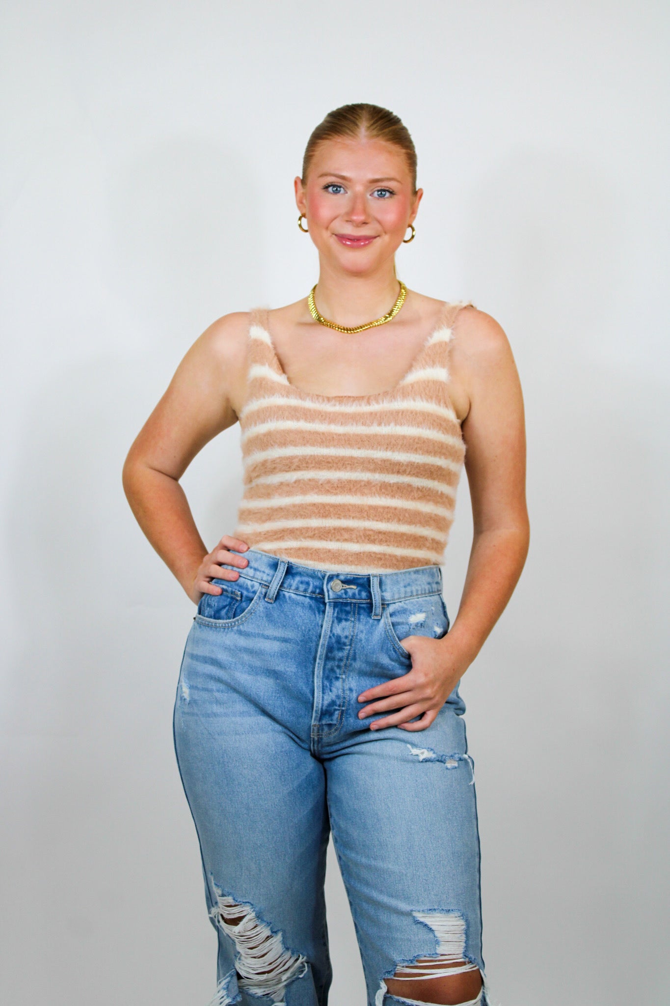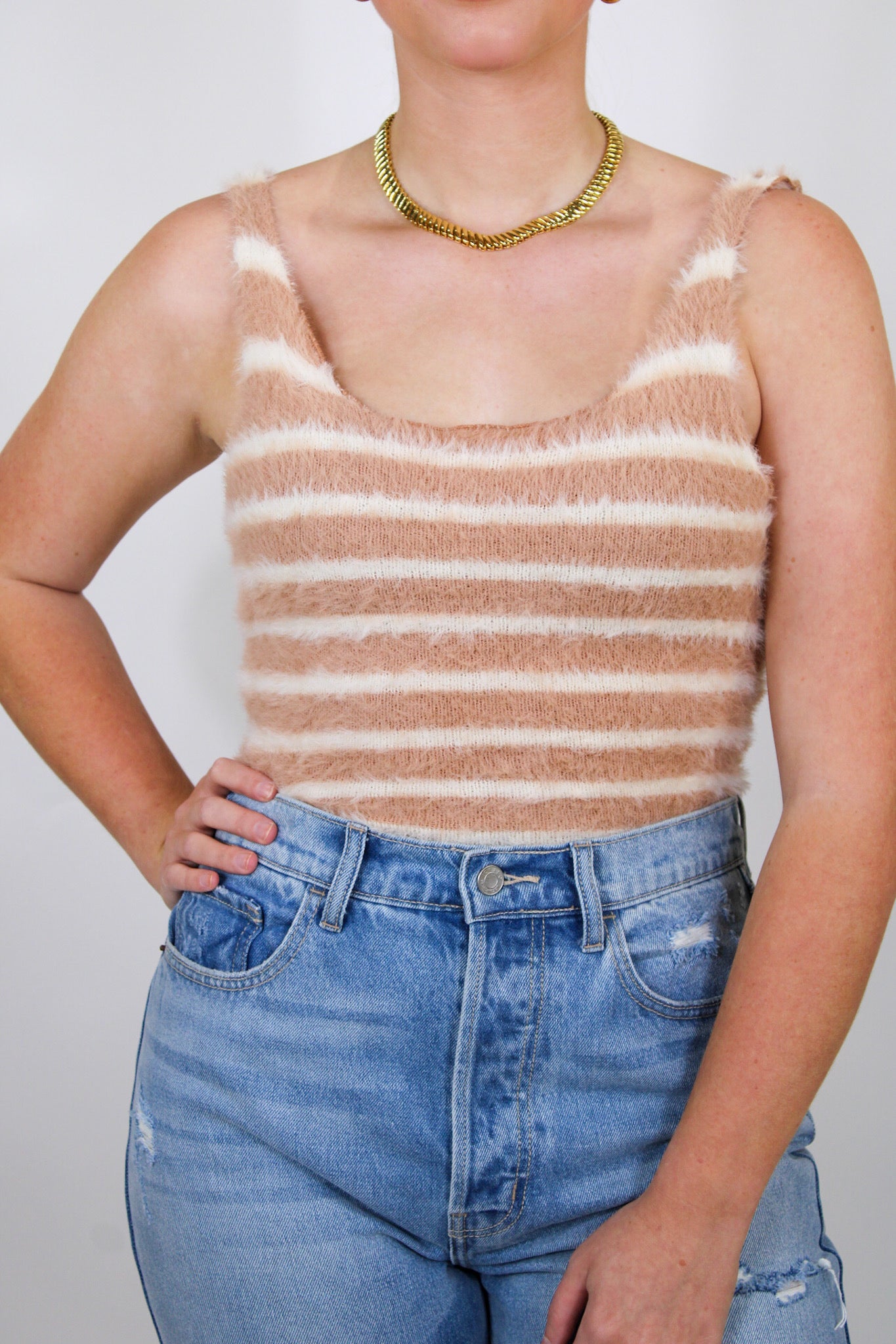 Courtney is a 5’6 wearing size small.-Nude & Cream Fuzzy Tank-Stripe Detailing-True To Size