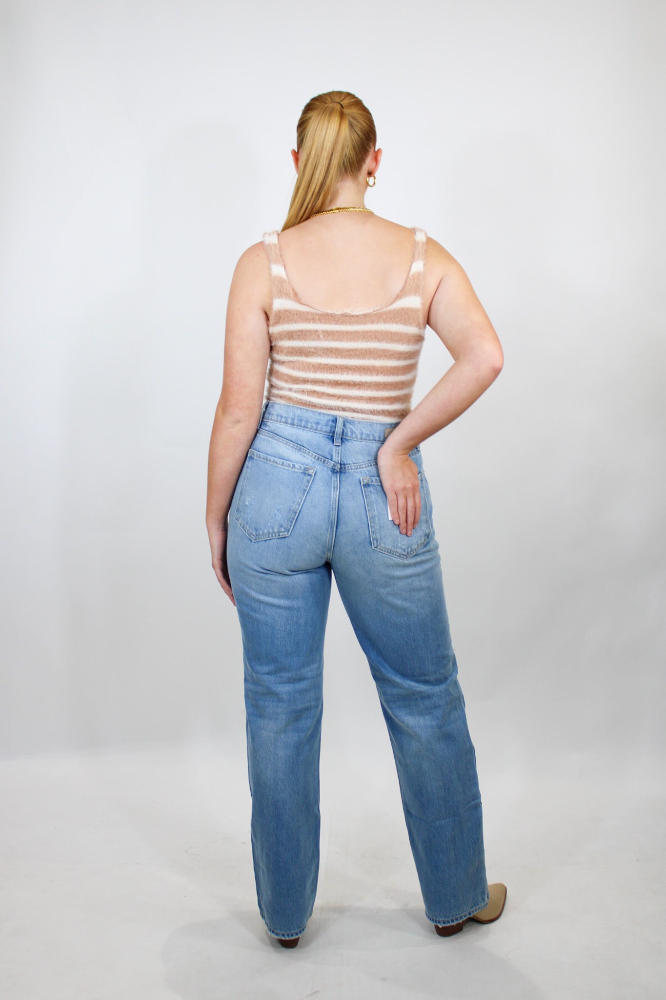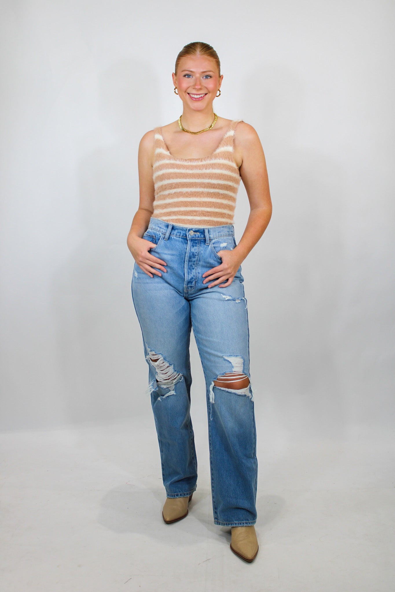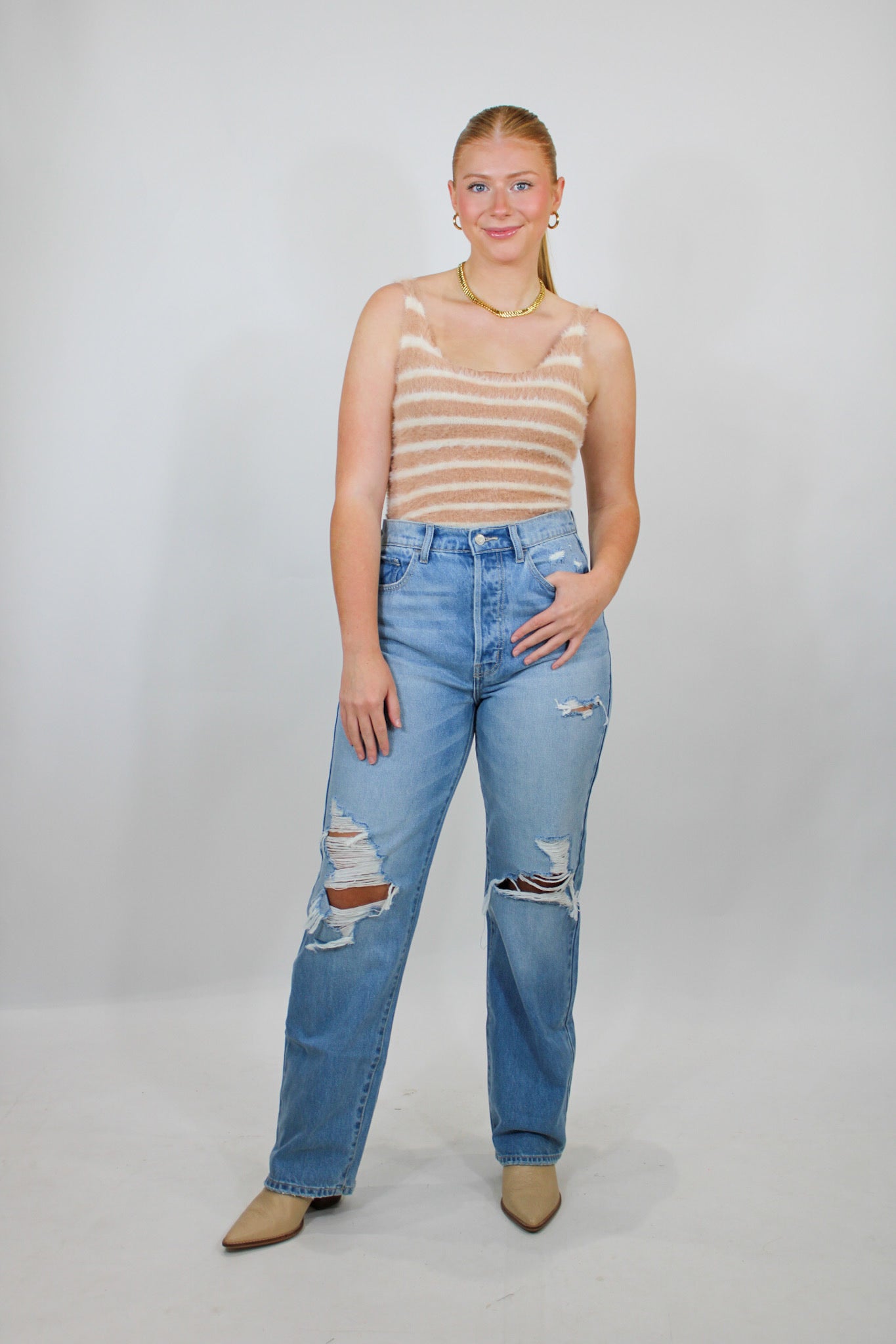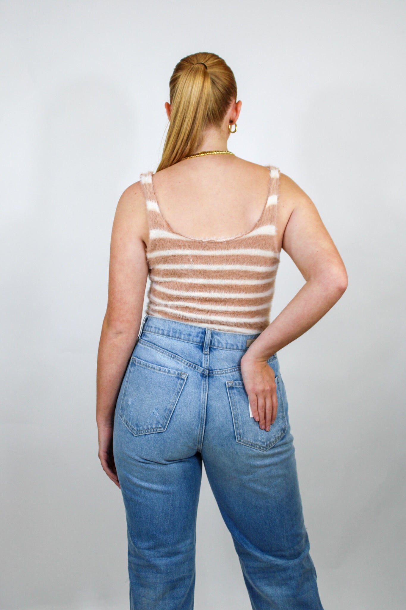 Courtney is a 5’6 wearing size small.-Nude & Cream Fuzzy Tank-Stripe Detailing-True To Size